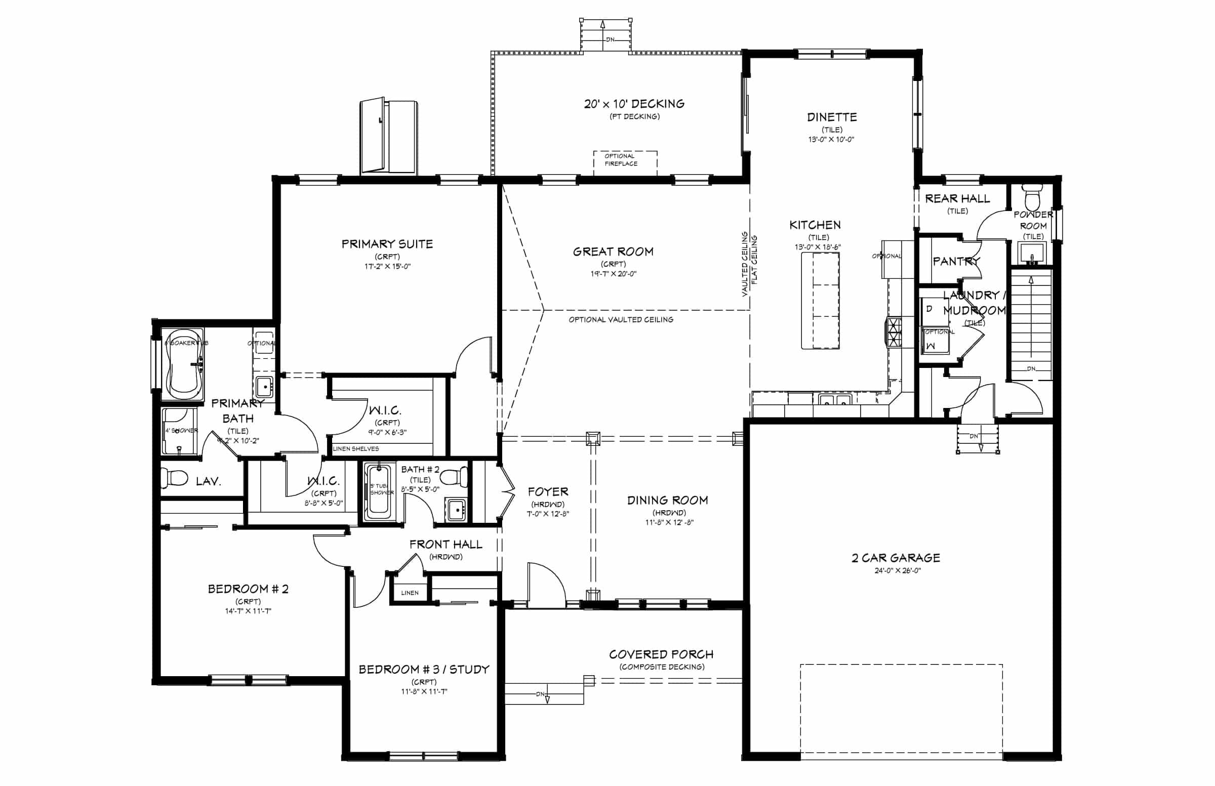 Open floor plan on one level with a well-designed Chef’s Kitchen w/ Dinette, 19’ 6″ X 20’ 8″ Great Room (with or without fireplace), Dining Room w/ crown moulding & chair railing, and laundry/mudroom w/half bath.